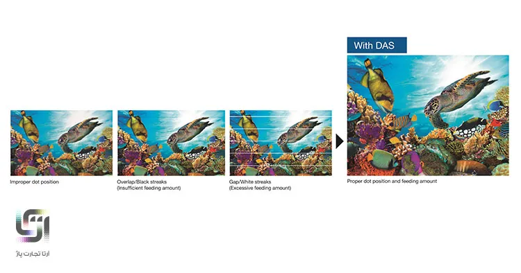 این قابلیت هنگامی که شرایط مدیا یا چاپ تغییر کند، موقعیت نقطه برخورد جوهر و مقدار آن با مدیا به تناسب لازم تنظیم می شود. از آنجایی که سیستم DAS به طور خودکار این عملیات را انجام می دهد، عملیات چاپ بدون هیچ گونه تغییراتی در تنظیمات توسط اپراتور انجام می گیرد.