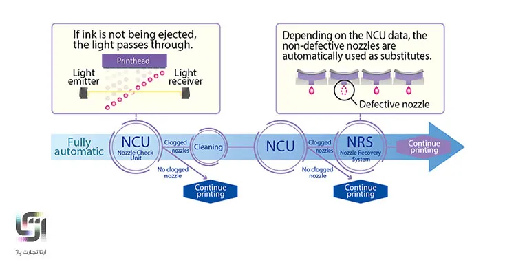 NCU (واحد بررسی نازل) وضعیت نازل ها را به طور خودکار بررسی و گرفتگی نازل را تشخیص می دهد. هنگامی که NCU نازل گرفته شده را تشخیص داد، به طور خودکار شروع به تمیز کردن نازل گرفته می کند. اگر تمیز کردن مشکل را حل نکرد، NRS (سیستم بازیابی نازل) به طور خودکار جایگزین نازل های معیوب می شود. این سیستم به کاربران این امکان را می دهد که بدون انتظار برای تعمیر توسط تکنسین به عملیات چاپ ادامه دهند.